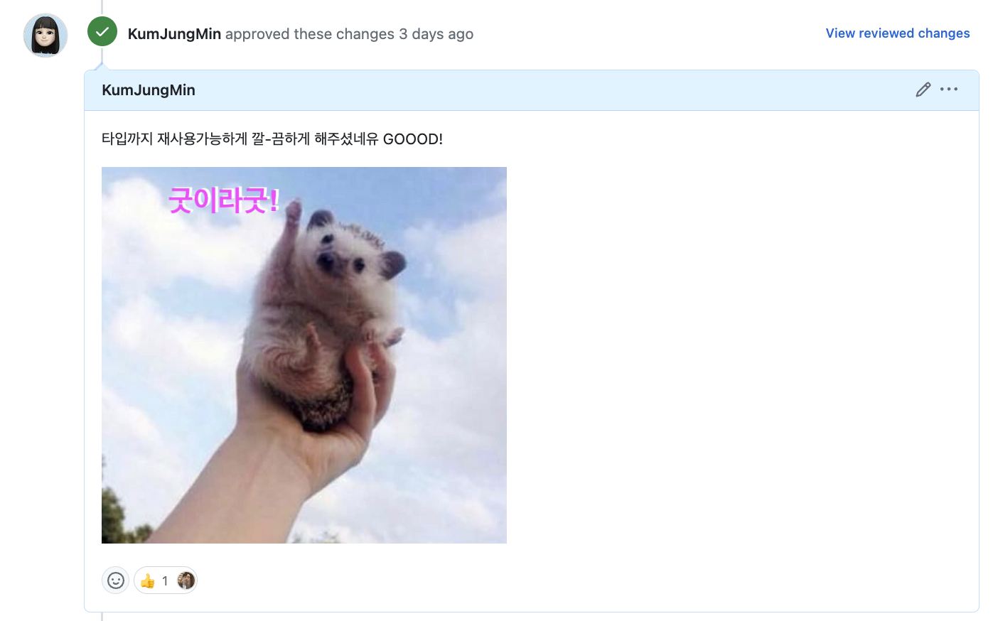 - 한 예시로 본인의 경우, 코멘트에 칭찬을 남길 때 짤과 이유를 같이 남기곤 한다.(아래 이미지는 주로 쓰는 짤)